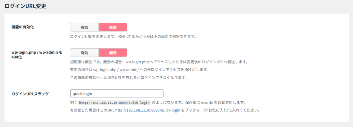 ログインURLを変更したい場合は【有効】にしてください。