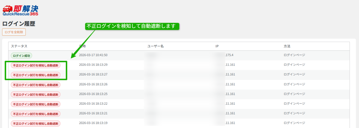 クイックレスキュー365の使い方:ログイン履歴