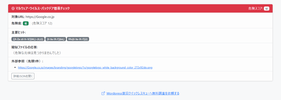 | Sucuri SiteCheck(オンライン) | 外部URLスキャン(表面のみ) | 英語 | 手動 | PC/スマホ | 無料 |