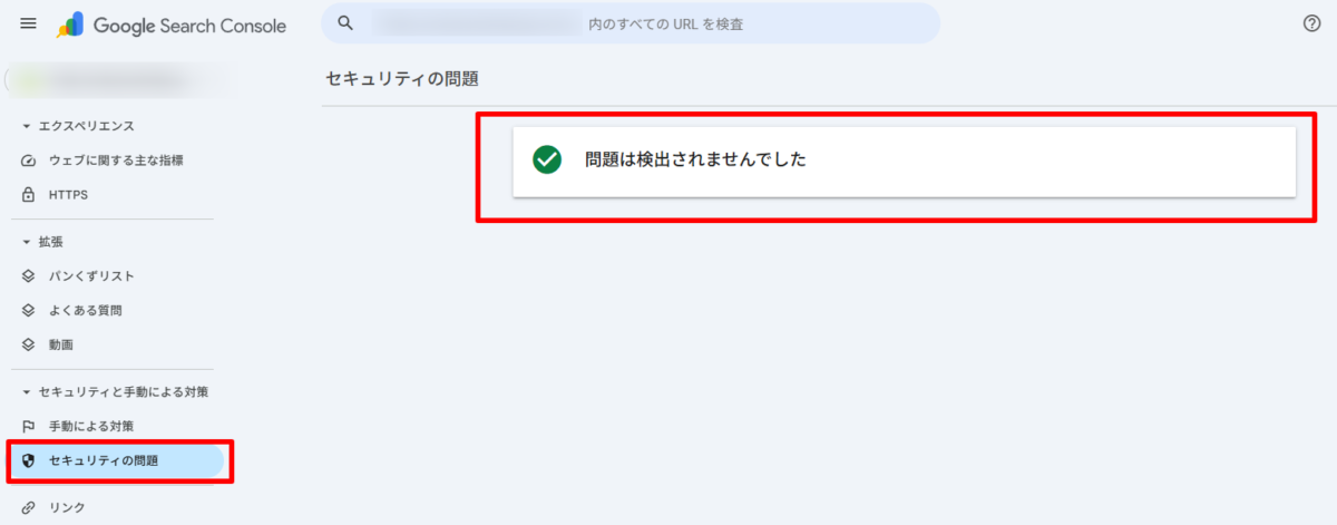 サーチコンソールに登録しているサイトは、Googleがマルウェアを検知すると「セキュリティの問題」として警告が届きます。左メニューの「セキュリティの問題」を定期的にチェックする習慣をつけましょう。