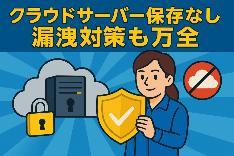 - 弊社でのクラウドサーバーに保存なし。漏洩対策も万全