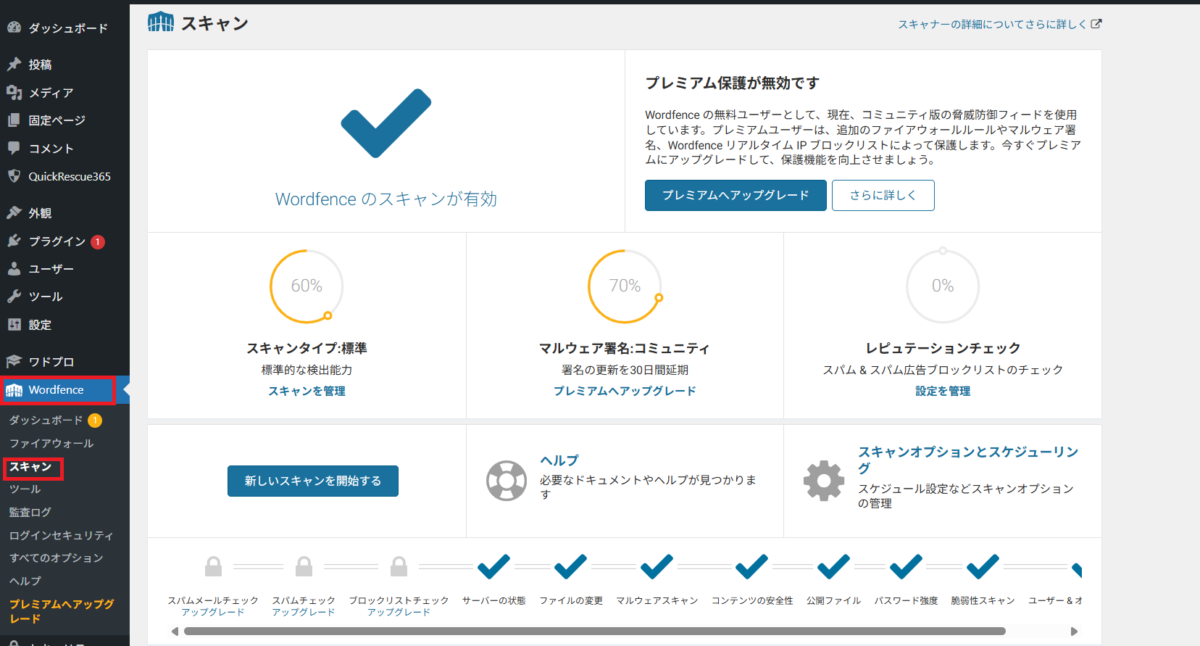 マルウェアのスキャンには「Wordfence Security」プラグインが有効です。無料で使えるスキャン機能で感染ファイルを検出し、コアファイルであれば自動修復も可能です。管理画面 →「プラグイン」→「新規追加」から「Wordfence」で検索してインストールしてください。