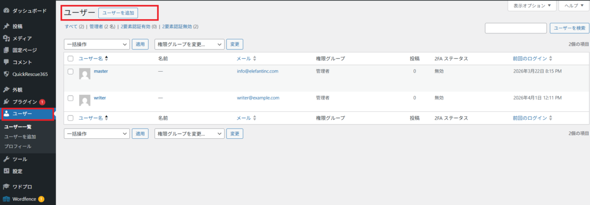 管理画面「ユーザー」一覧を開き、身に覚えのないアカウント(特に管理者権限)がないか確認します。不審なアカウントは即座に削除してください。