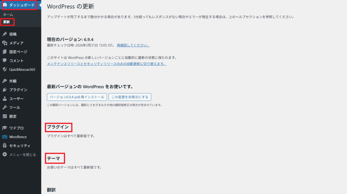 WordPress管理画面「ダッシュボード」→「更新」を開きます。WordPress本体・プラグイン・テーマのいずれかに未適用の更新がある場合、その脆弱性が侵入経路になっている可能性があります。