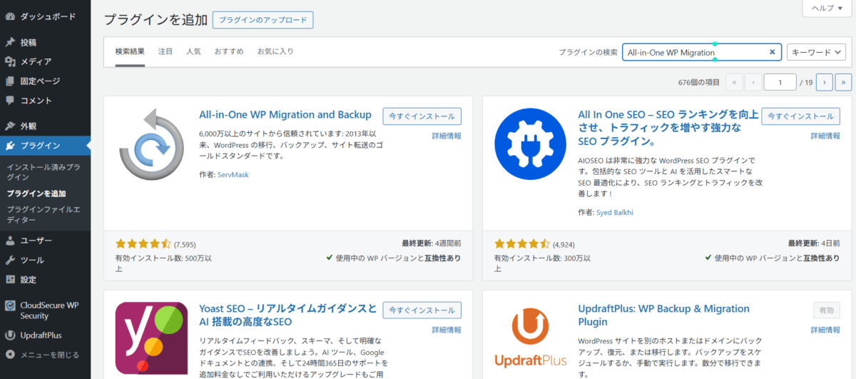 - 「All-in-One WP Migration」で検索