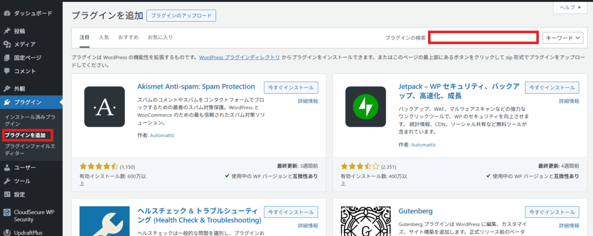 - WordPress管理画面 → 「プラグイン > 新規追加」