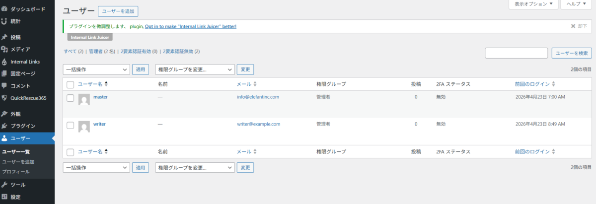 確認手順は、管理画面の「ユーザー」→「プロフィール」から該当項目を見るだけです。